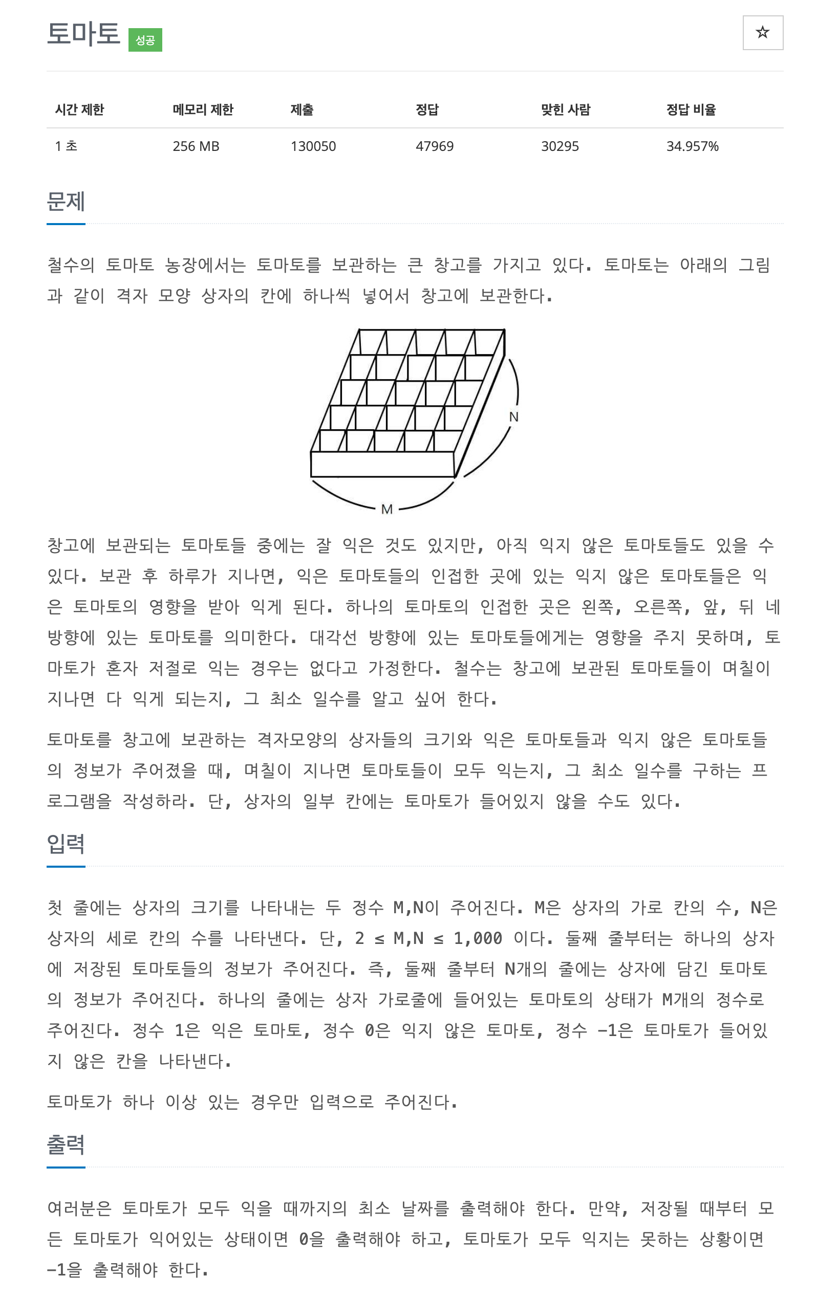 좌표(Point)를 저장하는 큐를 생성한다. 처음에 각 좌표의 값(0 또는 1 또는 -1)을 입력받을 때 1인 경우에는 미리 큐에 넣어두어 첫 날에 4방위를 토마토를 익게 하는 기준점들이 되게 한다. 상하좌우의 좌표를 확인하기 위해 y축에서 이동해야 하는 수와 x축에서 이동해야 하는 수를 크기가 4인 배열로 각각 만들어서 그 좌표가 1 ~ N 또는 1 ~ M의 크기이고, 그 값이 0이라면 1로 변화시킨다.