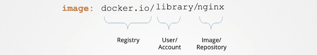 - 위의 `image` 값은 실제로는 `library/nginx` 에 해당한다. (첫 번째 part는 사용자 또는 계정 이름이나, 제공되지 않으면 라이브러리라고 인식한다.)