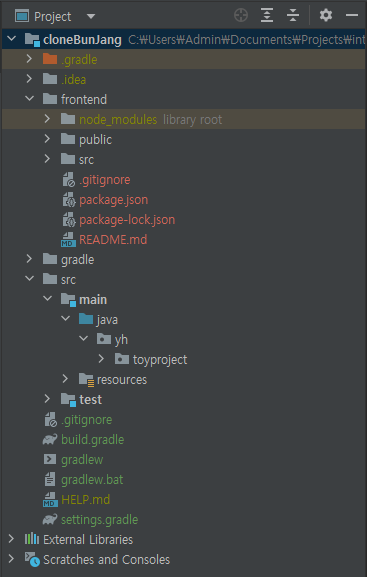 SpringBoot 프로젝트를 생성한 후 src 폴더와 같은 위치에 react 환경을 구성할 별도의 폴더를 만들어 여기에 create-react-app을 통해 리액트 어플리케이션을 생성했다. 이 부분까지는 아주 간단한 작업이며, 잘 정리해둔 블로그가 많으니 생략하겠다.